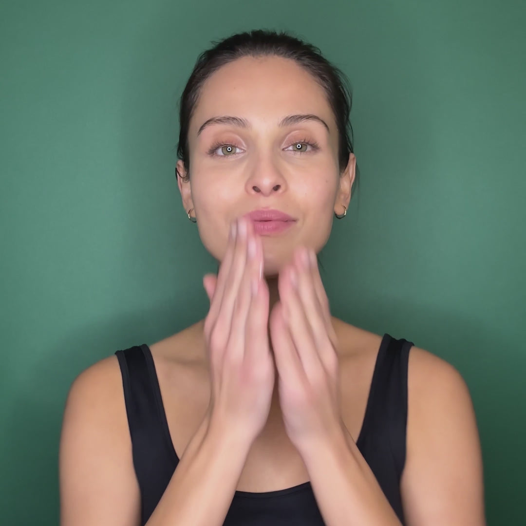 Smooth the skin from the inside out, over the 5 facial areas: forehead, lion wrinkle, nasolabial furrow, pomettes and oval.